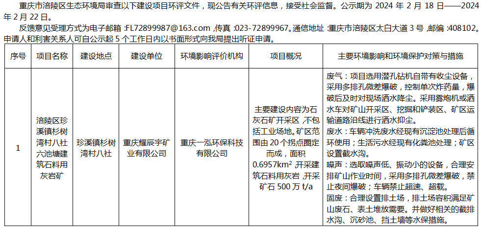 涪陵区生态环境局审查重庆耀辰宇矿业有限公司环评信息公示20240218