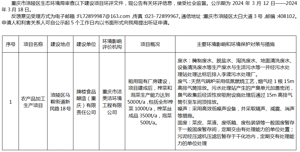 涪陵区生态环境局审查牌楼食品酿造(重庆)有限责任公司环评信息公示20240312