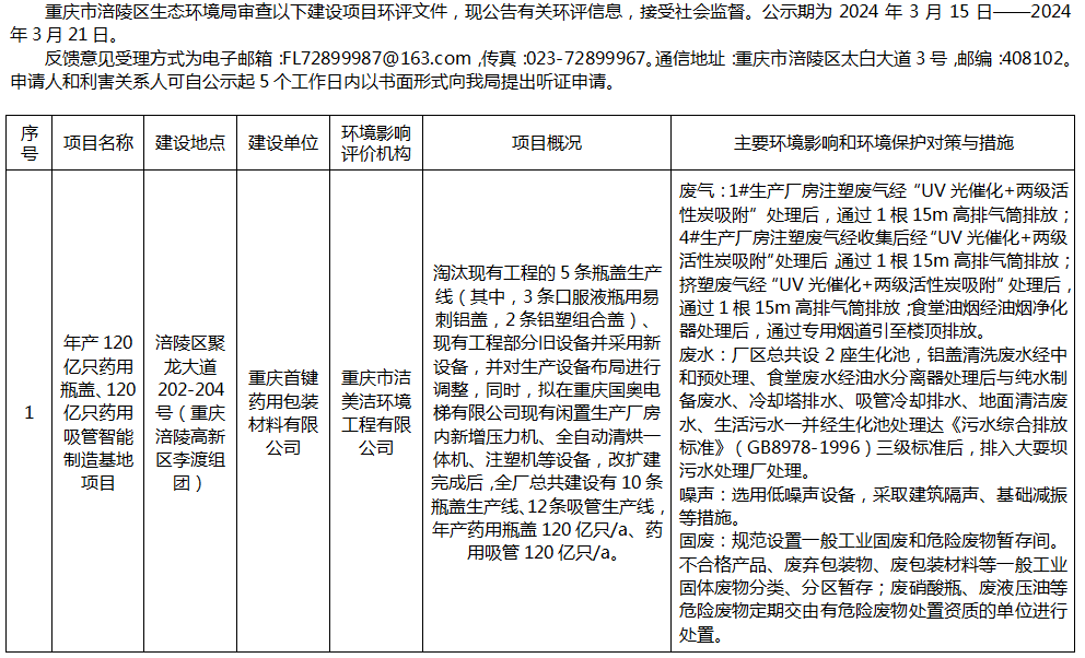 涪陵区生态环境局审查重庆首键药用包装材料有限公司环评信息公示20240315