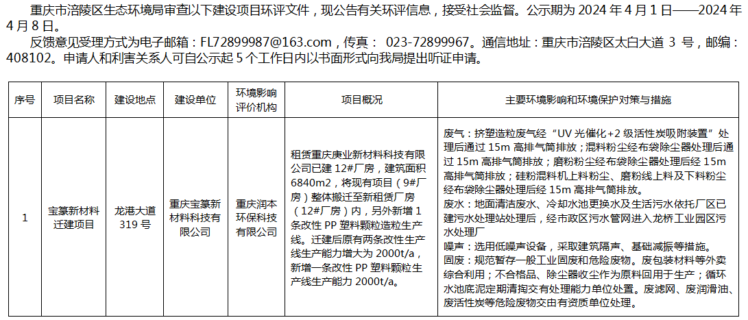 涪陵区生态环境局审查重庆宝篆新材料科技有限公司环评信息公示20240401