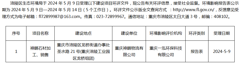 涪陵区生态环境局受理重庆神鹏物流有限公司项目环评信息公告20240509