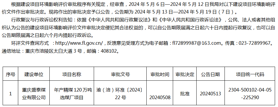 涪陵区生态环境局关于重庆盛泰煤业有限公司项目环评审批决定公告20240513