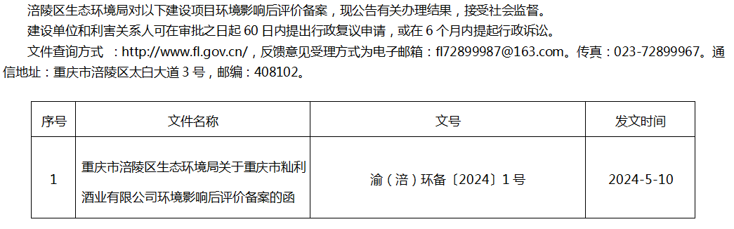 涪陵区生态环境局关于重庆市籼利酒业有限公司项目环境影响后评价备案公告20240513