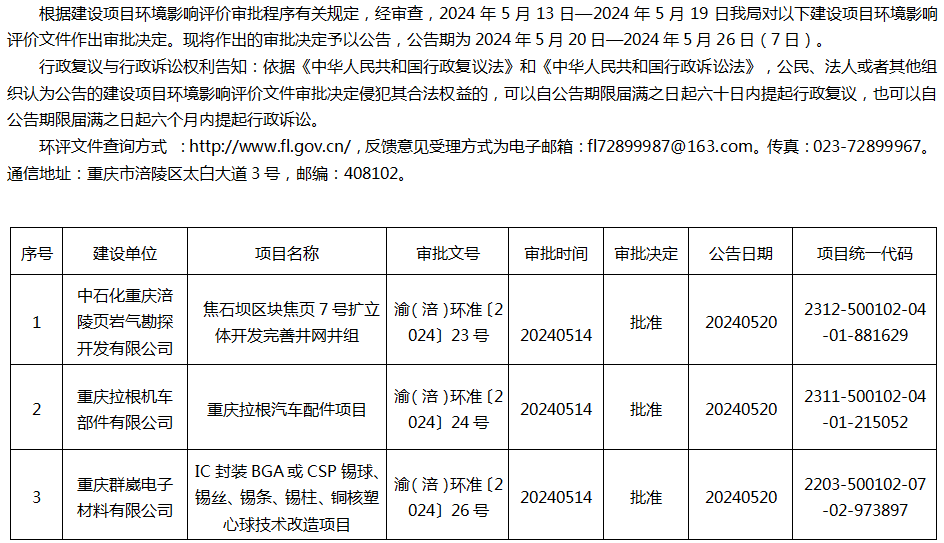 涪陵区生态环境局关于涪陵页岩气、拉根机车部件、群崴电子材料有限公司项目环评审批决定公告20240520