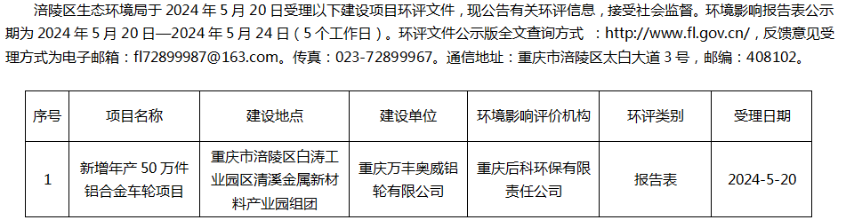 涪陵区生态环境局受理重庆万丰奥威铝轮有限公司项目环评信息公告20240520