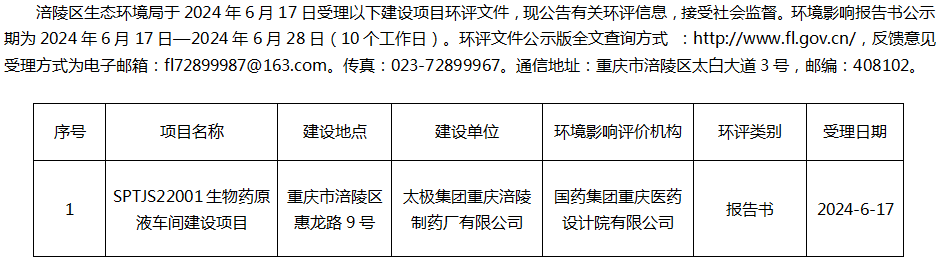 涪陵区生态环境局受理太极集团重庆涪陵制药厂有限公司项目环评信息公告20240617