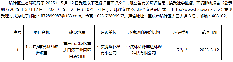 涪陵区生态环境局受理重庆腾泽化学有限公司建设项目环评信息公告20250512