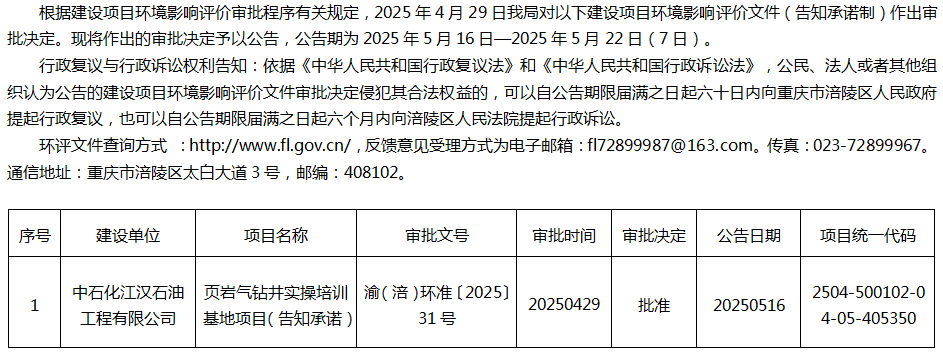 涪陵区生态环境局关于中石化江汉石油工程有限公司项目环评审批决定公告20250516