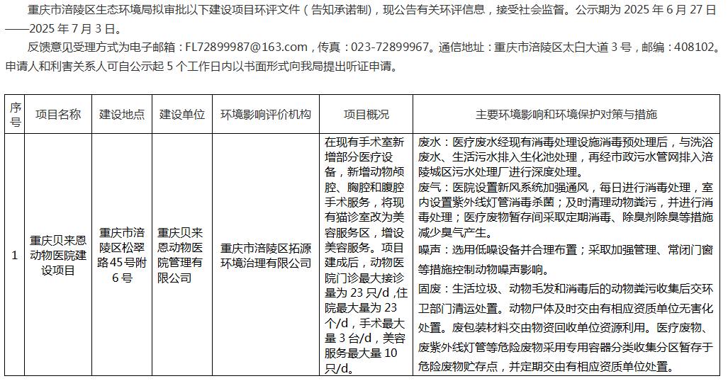 涪陵区生态环境局拟审批重庆贝来恩动物医院管理有限公司项目环评信息公示(告知承诺制)20250627