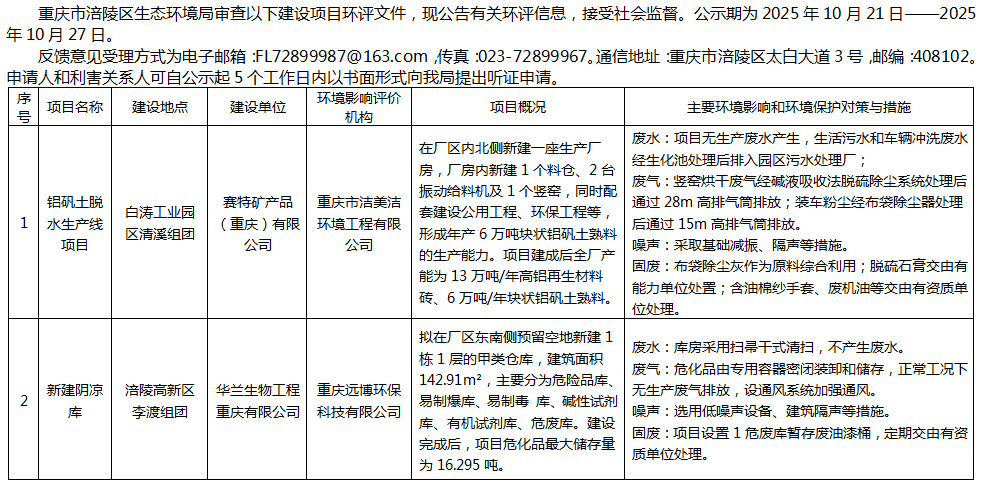 涪陵区生态环境局审查赛特矿产品(重庆)有限公司、华兰生物工程重庆有限公司环评信息公示20251021