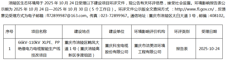 涪陵区生态环境局受理重庆科宝电缆股份有限公司建设项目环评信息公告20251024