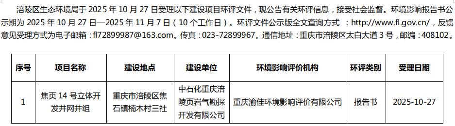 涪陵区生态环境局受理中石化重庆涪陵页岩气勘探开发有限公司建设项目环评信息公告20251027