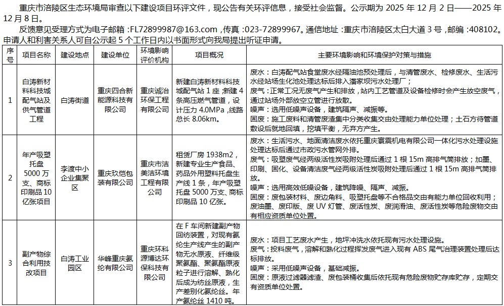 涪陵区生态环境局审查重庆四合新能源科技有限公司、华峰重庆氨纶有限公司、重庆玖恺包装有限公司环评信息公示20251202