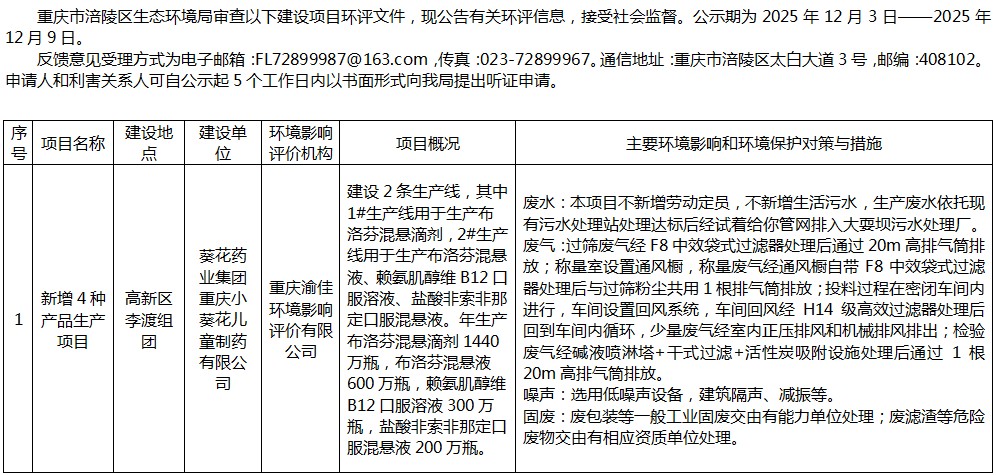 涪陵区生态环境局审查葵花药业集团重庆小葵花儿童制药有限公司环评信息公示20251203