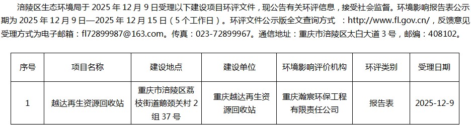 涪陵区生态环境局受理重庆越达再生资源回收站建设项目环评信息公告20251209