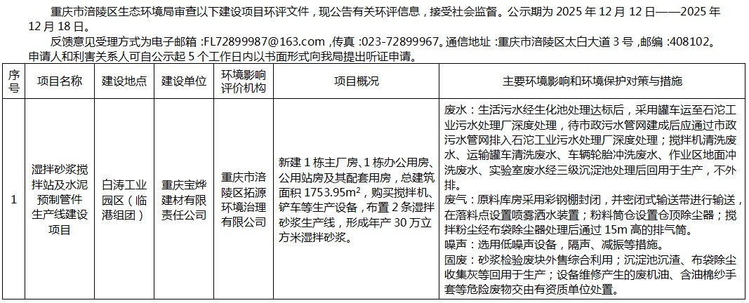 涪陵区生态环境局审查重庆宝烨建材有限责任公司环评信息公示20251212