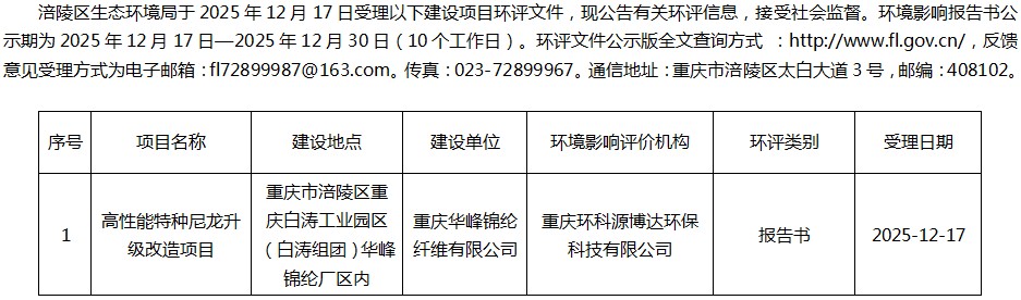 涪陵区生态环境局受理重庆华峰锦纶纤维有限公司建设项目环评信息公告20251217