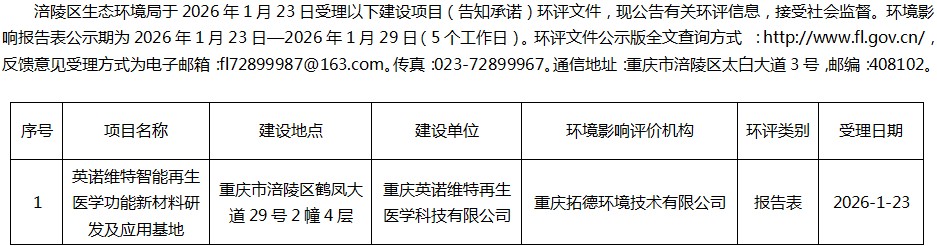 涪陵区生态环境局受理重庆英诺维特再生医学科技有限公司建设项目环评信息公告(告知承诺20260123)