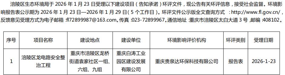 涪陵区生态环境局受理重庆白涛工业园区建设发展有限公司建设项目环评信息公告(告知承诺20260123)