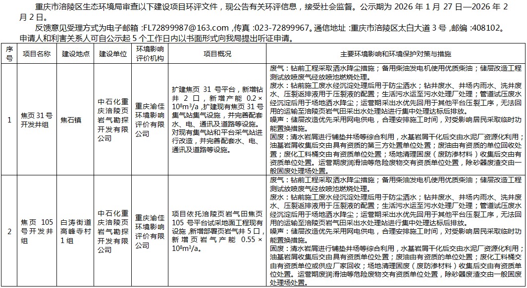 涪陵区生态环境局审查中石化重庆涪陵页岩气勘探开发有限公司环评信息公示20260127