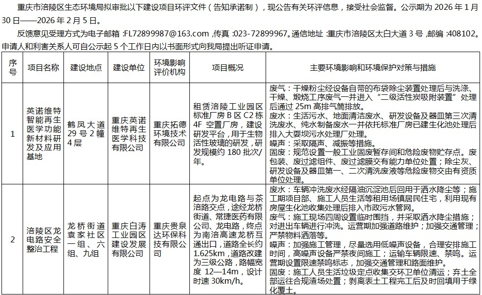 涪陵区生态环境局拟审批重庆英诺维特再生医学科技有限公司、重庆白涛工业园区建设发展有限公司环评信息公示表(告知承诺制)20260130