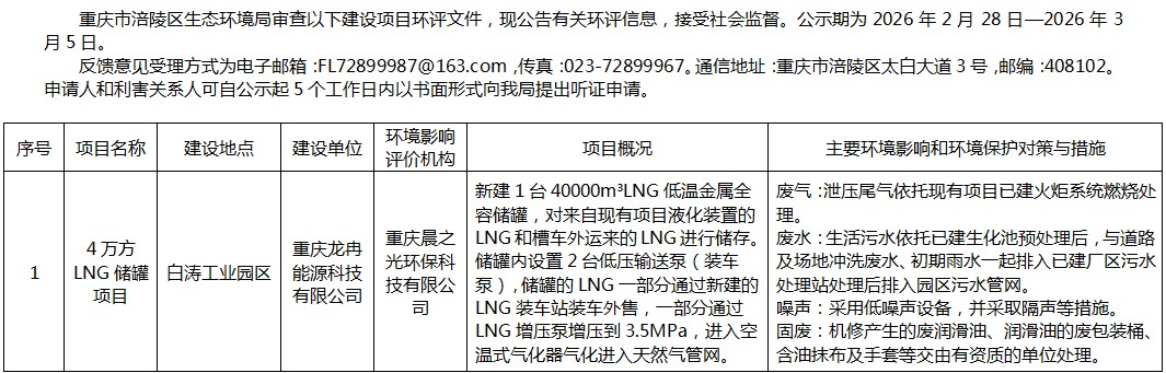 涪陵区生态环境局审查重庆龙冉能源科技有限公司环评信息公示20260228