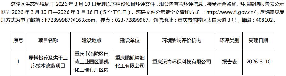 涪陵区生态环境局受理重庆鹏凯精细化工有限公司建设项目环评信息公告20260310