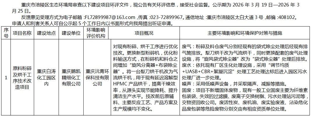 涪陵区生态环境局审查重庆鹏凯精细化工有限公司环评信息公示20260319