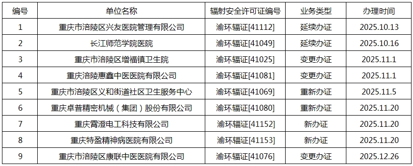 涪陵区生态环境局2025年第四季度辐射安全许可证公示