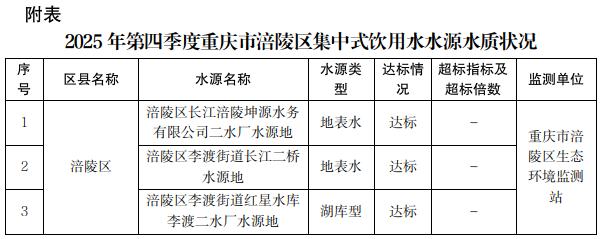 2025年第四季度,监测的3个在用集中式生活饮用水水源均达标(达到或优于Ⅲ类标准),水质达标率为100%。水质达标状况详见附表。
