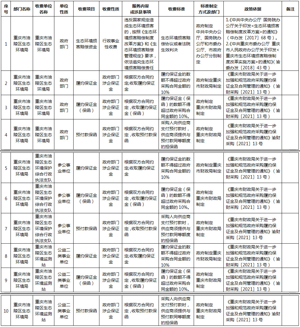 涪陵区生态环境局及下属单位综合性涉企收费目录清单
