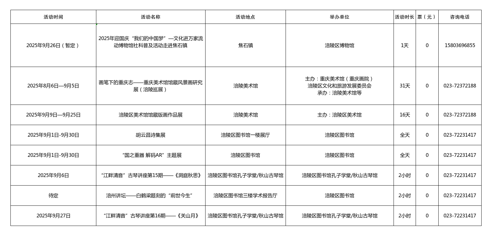 涪陵区2025年9月主要展览、讲座活动