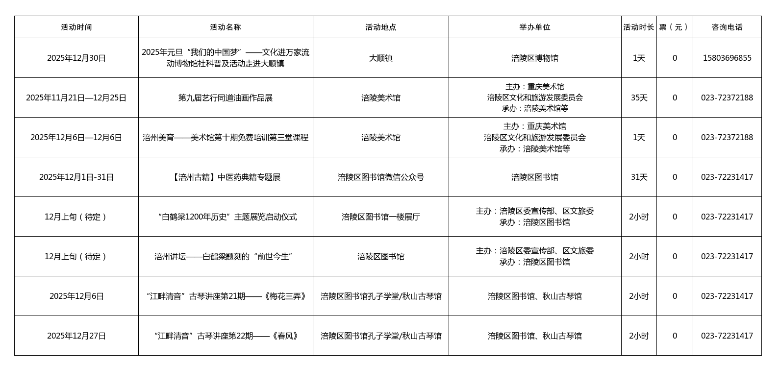 涪陵区2025年12月主要展览、讲座活动