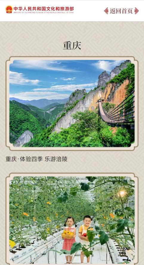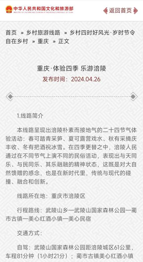 近日,文化和旅游部推出“岁时节令 自在乡村”全国乡村旅游精品路线,重庆两条线路上榜。涪陵报送的“体验四季 乐游涪陵”成为专版推荐。线路介绍了涪陵武陵山大裂谷、武陵山国家森林公园、美心红酒小镇、美心特色民宿等景点在四季更迭中展现的不同节气的民俗活动,充分体现了涪陵人民与天同乐、与民同乐、其乐融融的精神状态。
