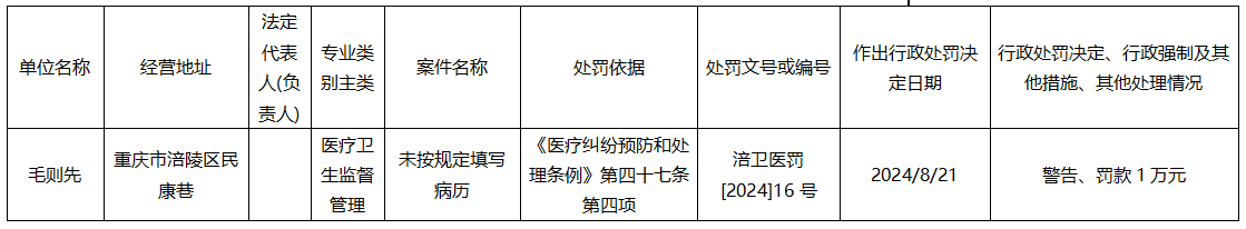 2024年8月涪陵区卫生健康委员会行政处罚汇总(三)