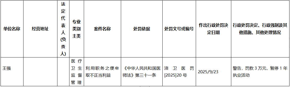 2025年9月涪陵区卫生健康委员会行政处罚汇总(二)