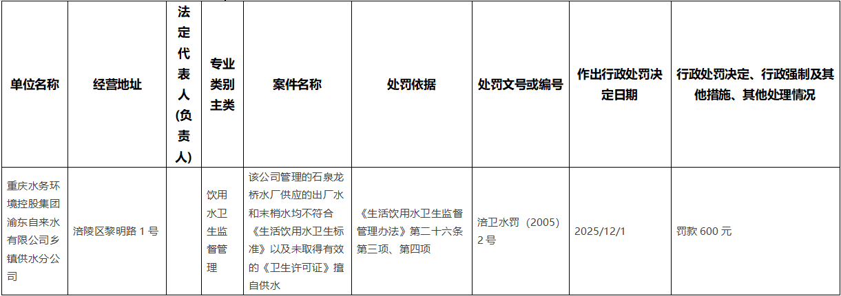 2025年12月涪陵区卫生健康委员会行政处罚汇总