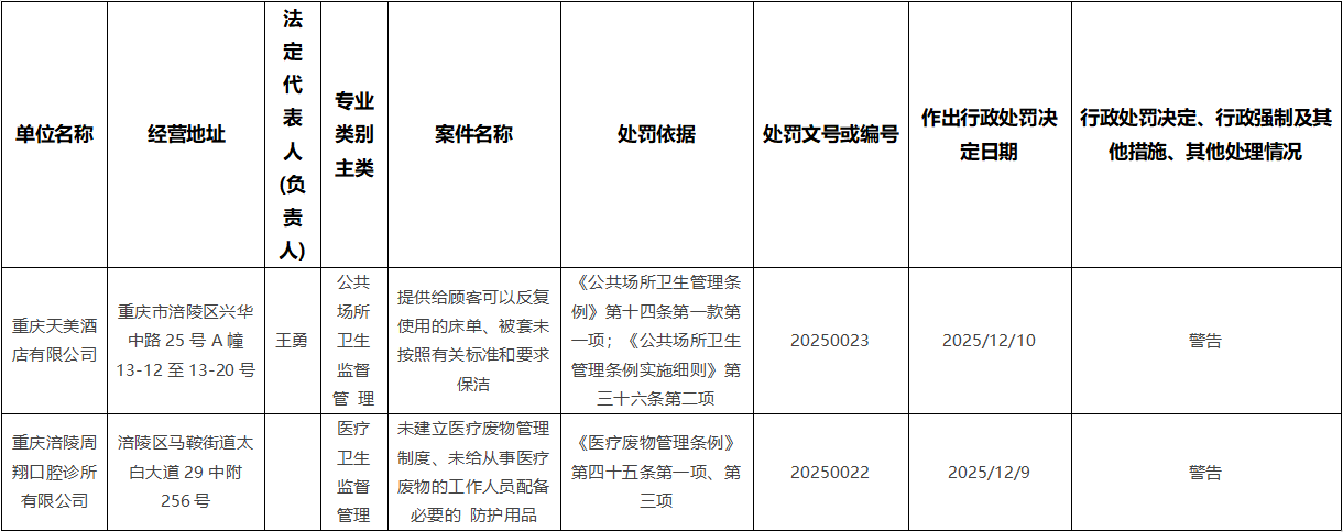 2025年12月涪陵区卫生健康委员会行政处罚汇总(二)
