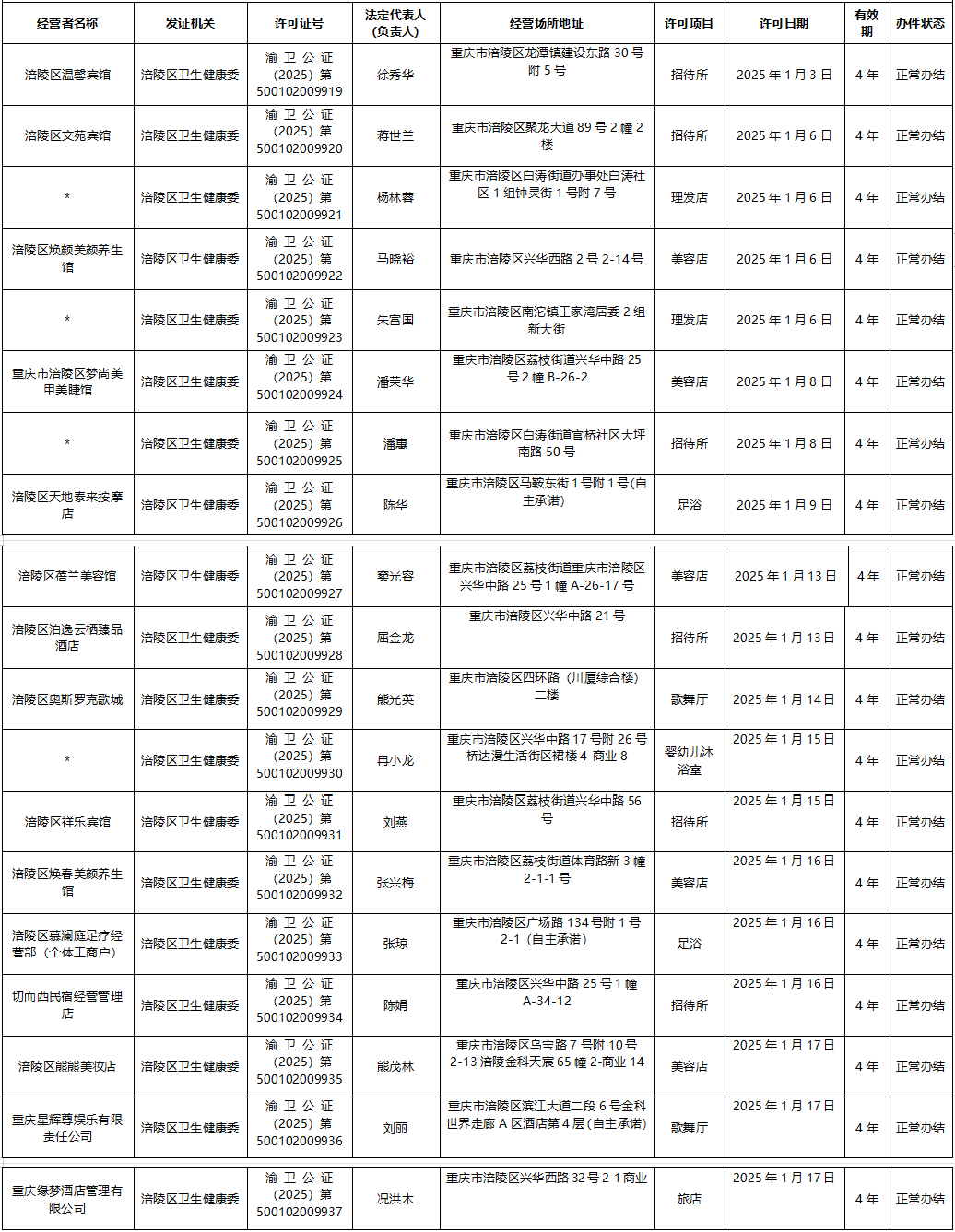 涪陵区公共场所卫生许可(除饭馆、咖啡馆、酒吧、茶座等外)2025年1月2日-1月17日新办信息