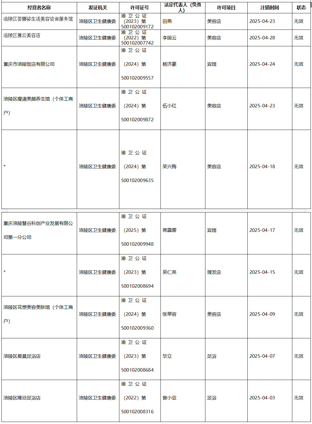 涪陵区公共场所卫生许可(除饭馆、咖啡馆、酒吧、茶座等外)2025年4月3日-4月30日注销信息
