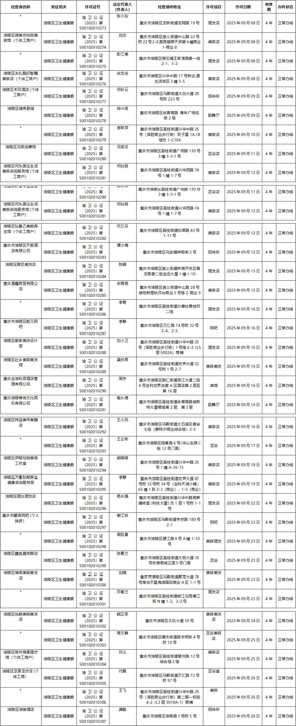 涪陵区公共场所卫生许可(除饭馆、咖啡馆、酒吧、茶座等外)2025年9月6日-9月28日新办信息