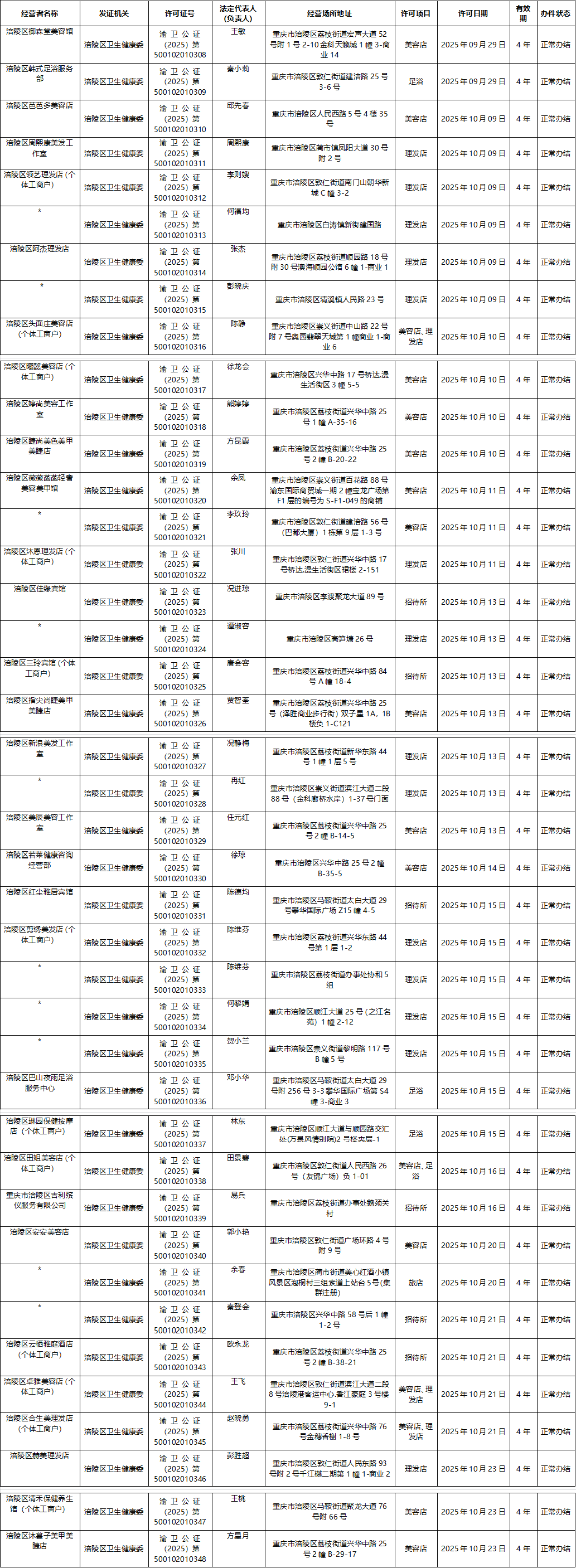 涪陵区公共场所卫生许可(除饭馆、咖啡馆、酒吧、茶座等外)2025年9月29日-10月24日新办信息