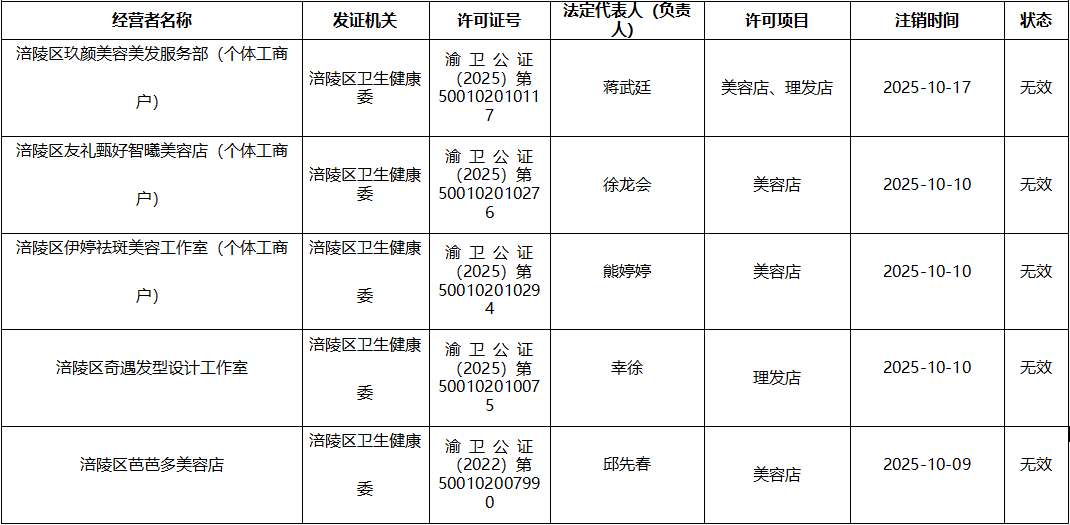 涪陵区公共场所卫生许可(除饭馆、咖啡馆、酒吧、茶座等外)2025年9月29日-10月24日注销信息