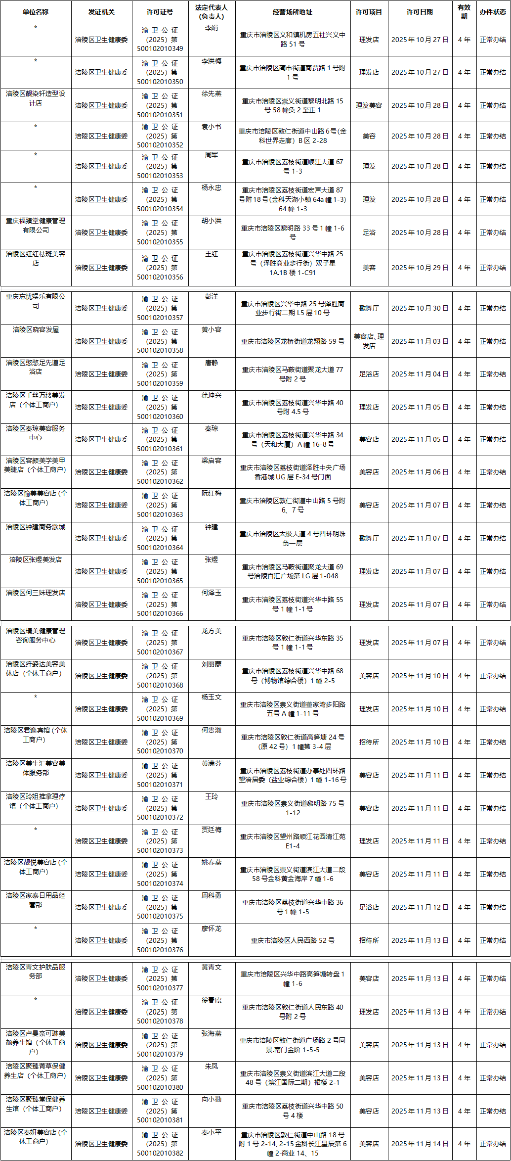 涪陵区公共场所卫生许可(除饭馆、咖啡馆、酒吧、茶座等外)2025年10月25日-11月14日新办信息