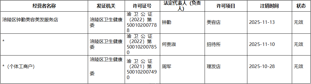 涪陵区公共场所卫生许可(除饭馆、咖啡馆、酒吧、茶座等外)2025年10月25日-11月14日注销信息