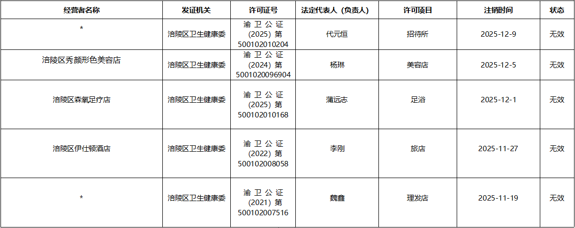 涪陵区公共场所卫生许可(除饭馆、咖啡馆、酒吧、茶座等外)2025年11月15日-12月11日注销信息