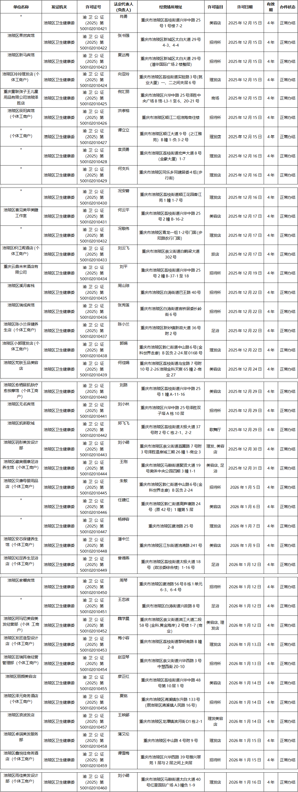 涪陵区公共场所卫生许可(除饭馆、咖啡馆、酒吧、茶座等外)2025年12月12日-2026年1月16日新办信息
