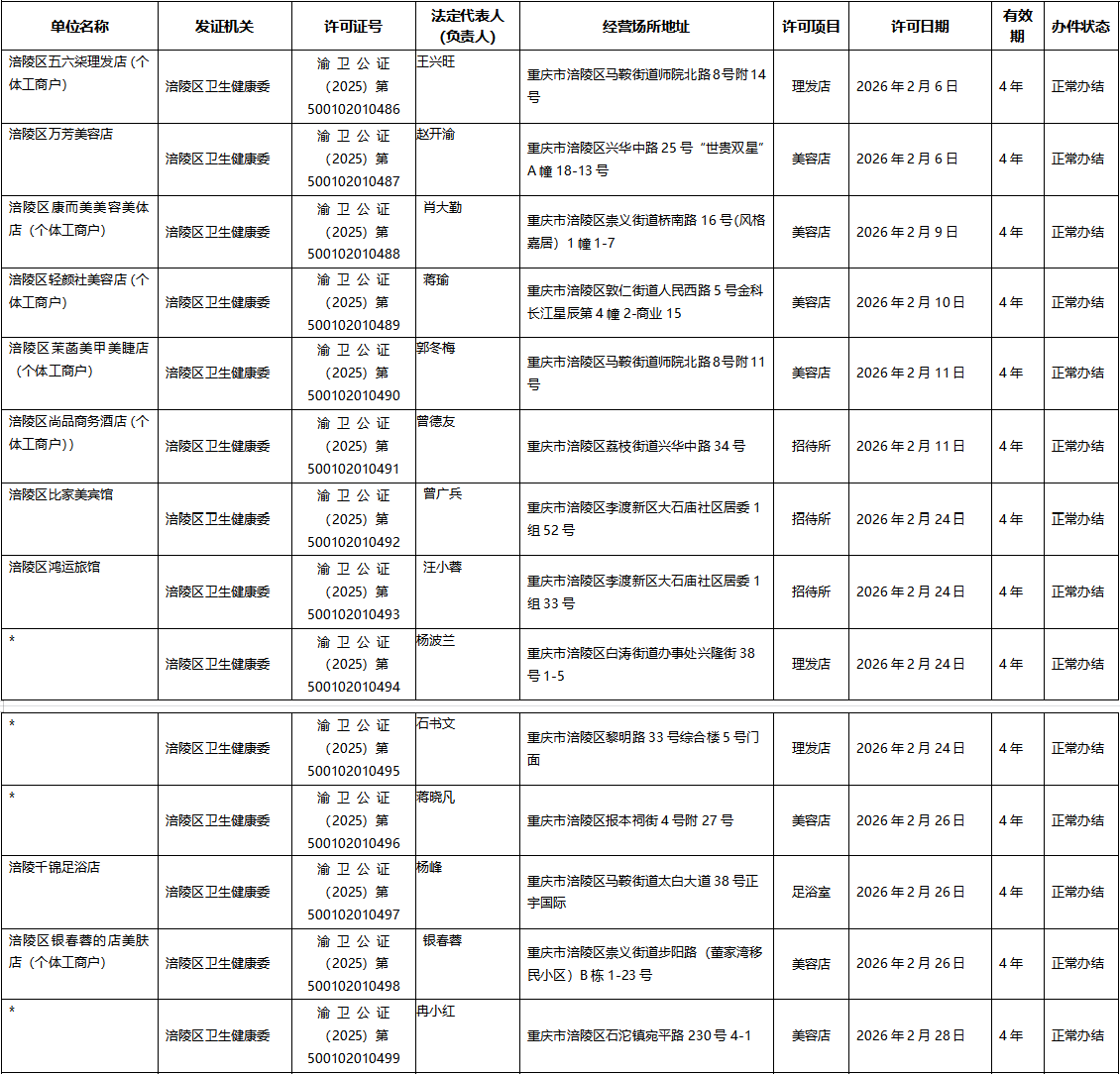 涪陵区公共场所卫生许可(除饭馆、咖啡馆、酒吧、茶座等外)2026年2月7日-2026年2月28日新办信息