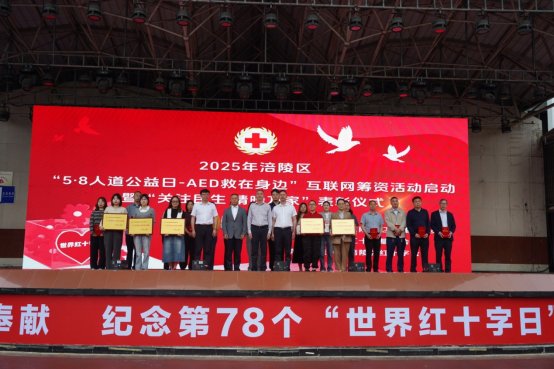 5月8日,涪陵区2025年“5·8人道公益日—AED救在身边”互联网筹资活动启动暨“关注民生 情暖万家”表彰仪式在易家坝广场举行。市红十字会二级巡视员、市红十字基金会理事长彭超,区政府副区长、区红十字会会长郑小平,区卫生健康委党委书记、主任袁鸿剑,委党委委员、副主任洪亮参加。
