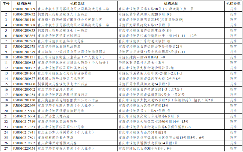 为落实定点医药机构协议动态管理要求,根据国家医疗保障局《医疗机构医疗保障定点管理暂行办法》《零售药店医疗保障定点管理暂行办法》及《重庆市医疗保险协议医疗机构服务协议》《重庆市医疗保险协议零售药店服务协议》等文件规定,解除以下定点医药机构医保服务协议。